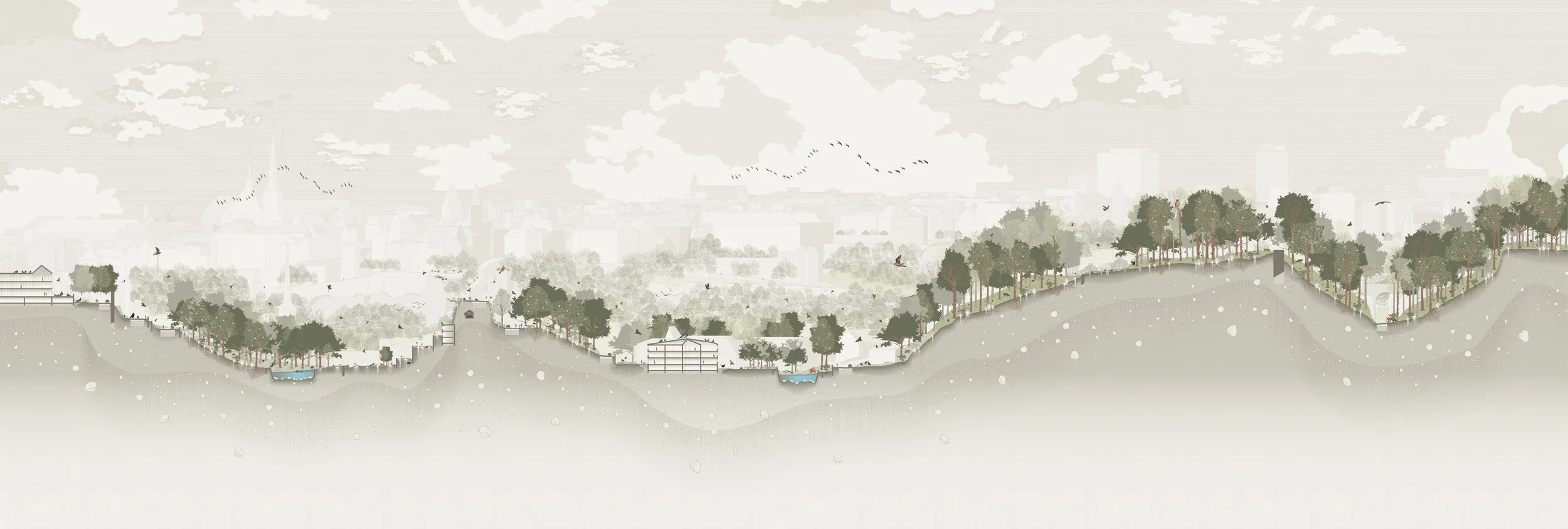 This slice of the city reveals a chain of thresholds: gardens, parks, forests, sandstone cliffs, wetlands, and occasional buildings. Together, they form a sheltered enclave beneath the historic district, acting as a quasi-natural cocoon